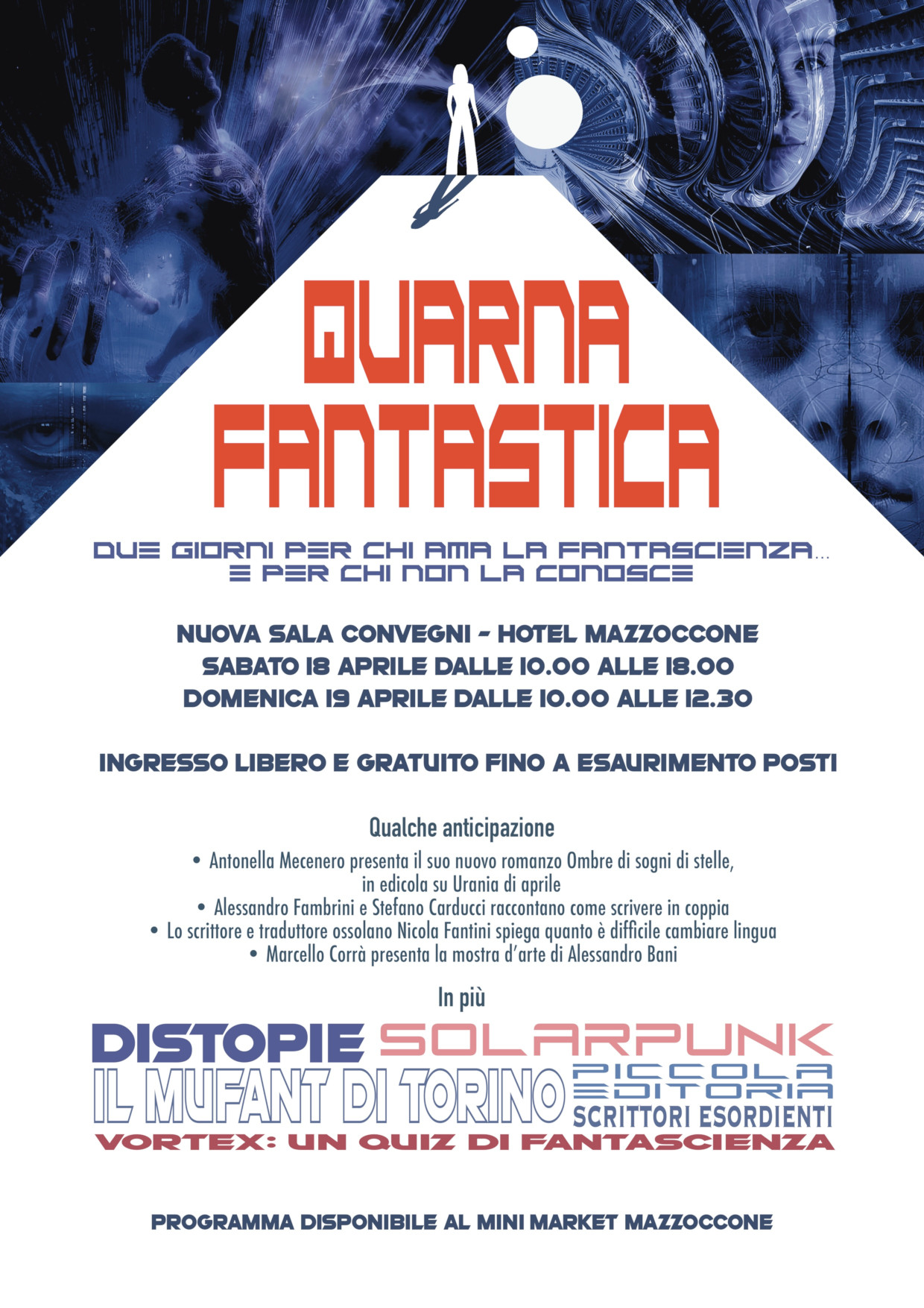 “QUARNA FANTASTICA” – Due giorni per chi ama la Fantascienza che si terrà a Quarna Sopra (VB) dal 18 al 19 aprile 2026 presso la sala convegni dell’Hotel Monte Mazzoccone, via Quarelli, è una Convention Fantascientifica organizzata con il sostegno del Comune di Quarna Sopra e grazie alla disponibilità del proprietario della location che ospita l’evento. In seno alla manifestazione due iniziative collaterali presenti nella sala convegni: