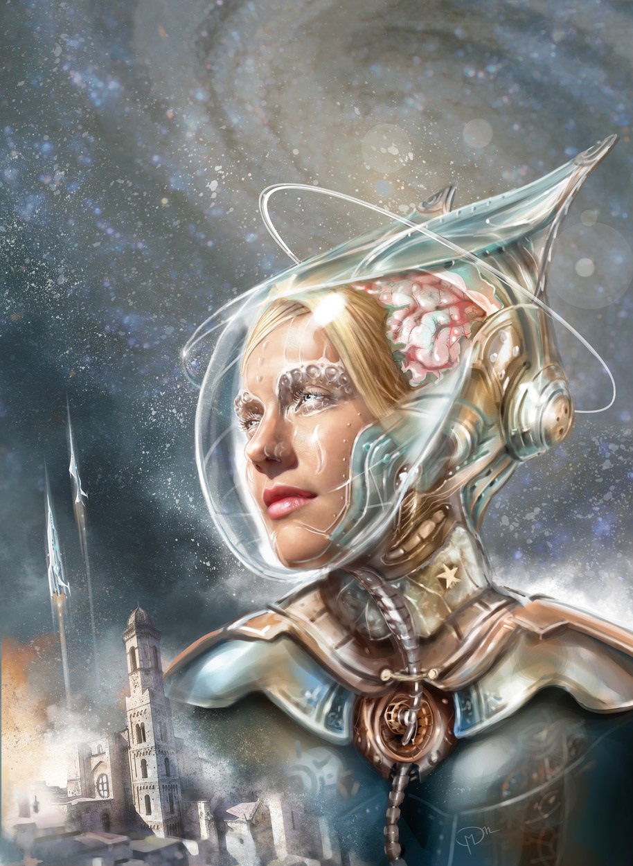 L’illustrazione rappresenta una donna alata, dalle fattezze orientali, in tuta spaziale, che si staglia contro l’immensità del Cosmo al di sopra di un pianeta azzurro. È un’opera che vive di vita propria, anche se le sfumature del suo significato possono essere comprese appieno soltanto leggendo la storia originale. La tavola è stata apprezzata in più occasioni, divenendo forse una delle più premiate nella mia carriera. Dapprima inclusa in entrambi gli annuari Infected by Art e Spectrum, è stata ripubblicata come cover di Asimov’s Science Fiction magazine, vincendo l’Asimov’s Readers’ Award come Miglior Cover dell’anno, e poi ancora è stata scelta come Cover per The Year’s Best Science Fiction, la 32a raccolta del Meglio della Fantascienza edita da Gardner Dozois. Durante la WorldCon di Londra nel 2014 si è aggiudicata il Premio di Miglior lavoro digitale esposto nell’Art Show… ma la soddisfazione più grande credo di averla ricevuta vedendola campeggiare nel sito ufficiale della Le Guin!