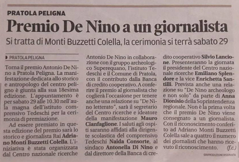 Ad Adriano Monti Buzzetti Colella il Premio “A. De Nino” Non ci sorprende affatto che soci della World SF Italia ricevano riconoscimenti prestigiosi come accadrà sabato al nostro Adriano Monti Buzzetti. Non siamo soltanto bravi autori o saggisti o illustratori o editori o traduttori o giornalisti – come ha dimostrato Adriano – ecc. ecc. Esaminati uno a uno ciascuno ha delle peculiarità non comuni che portano all’apice della propria, chiamiamola… categoria. Per ora potrete leggere la notizia sul ritaglio di giornale, ma dopo sabato, quando certamente Adriano ci farà avere qualche foto della premiazione, potremo inserire nel nostro sito un reportage più ricco e interessante.