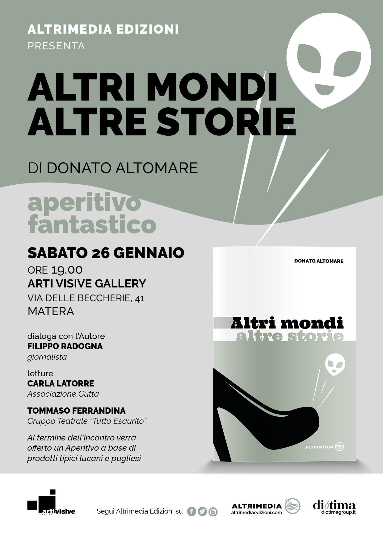 Aperitivo “fantastico” con Donato Altomare Sabato 26 Gennaio 2019, a Matera, alle ore 19,00 presso l’ Arti Visive Gallery Via delle Beccherie, 41, si terrà la presentazione di “Altri mondi altre storie” (Altrimedia Edizioni), la nuova antologia del socio Donato Altomare.