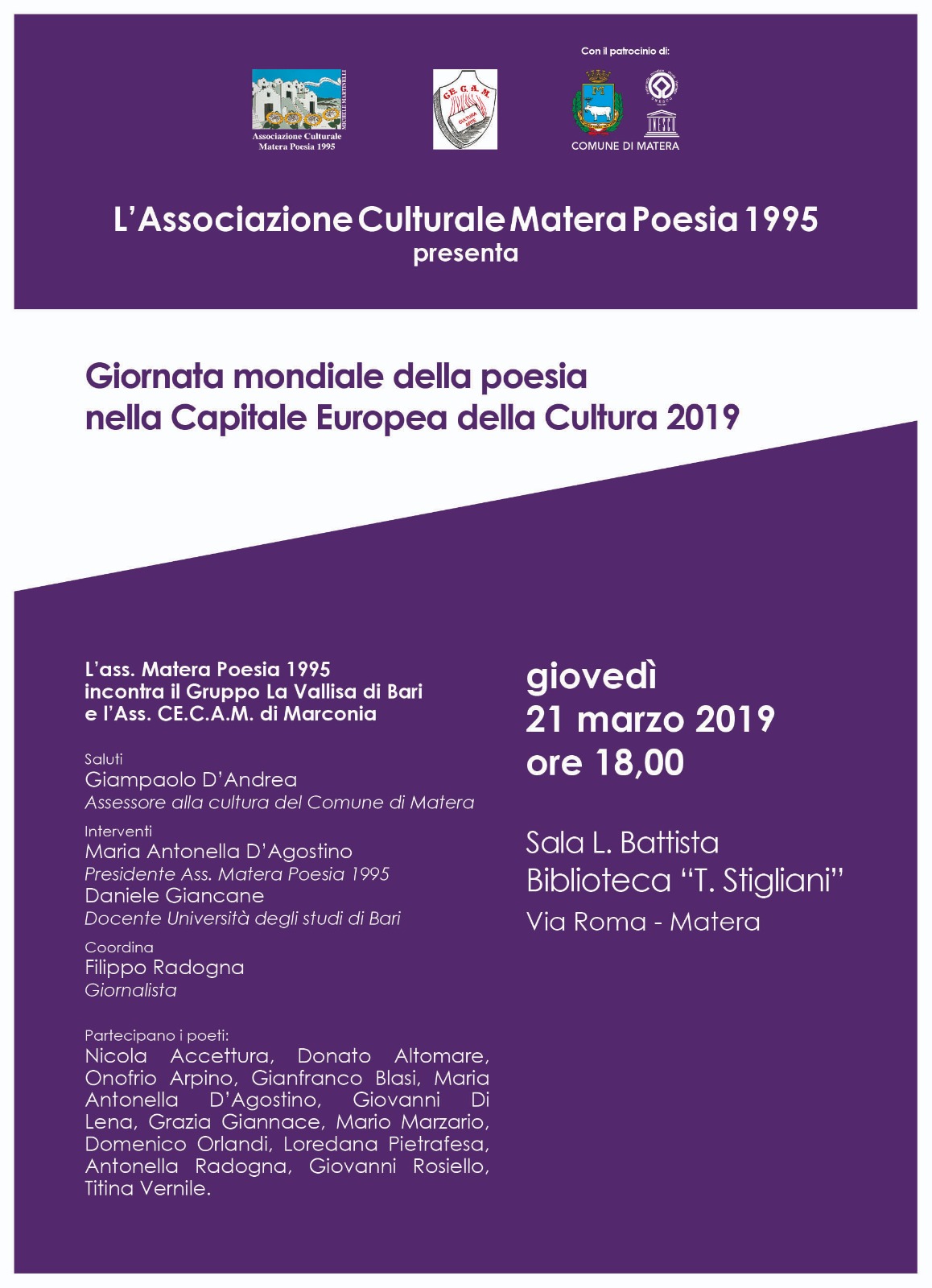 La Giornata mondiale della poesia a Matera Giovedì 21, marzo con inizio alle ore 18, nella Biblioteca provinciale “T. Stigliani” di Matera, in occasione della Giornata mondiale della poesia, l’Associazione Matera Poesia 95, organizza un gemellaggio con il Gruppo La Vallisa di Bari e l’Associazione CECAM di Marconia di Pisticci. La manifestazione è patrocinata dal Comune di Matera.