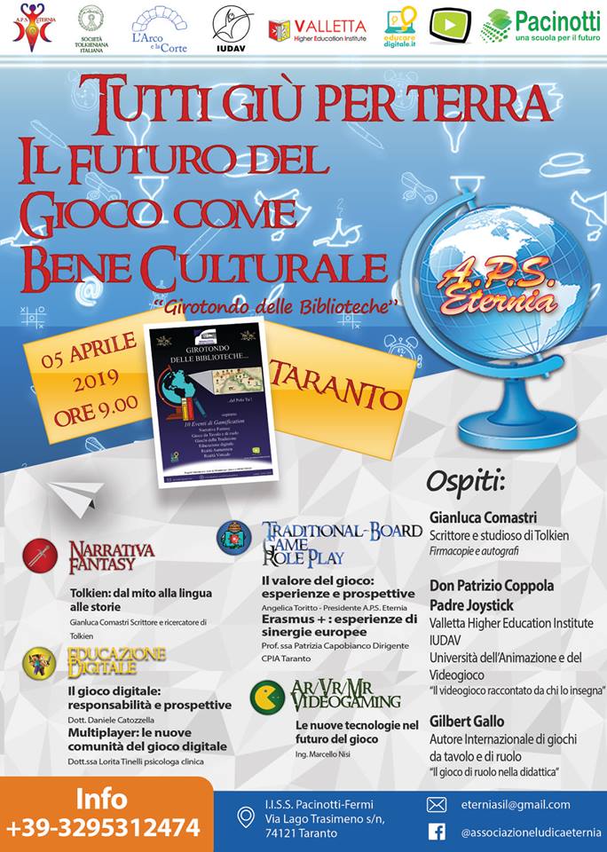 Tutti giù per terra Venerdì 5, aprile con inizio alle ore 9, presso l’Aula Magna dell’IISS “Pacinotti-Fermi” di Taranto, si terrà la giornata “Tutti giù per terra. Il girotondo delle biblioteche: il futuro del gioco come bene culturale“. Obiettivo della manifestazione è quello di fornire i risultati del progetto “Girotondo delle Biblioteche” organizzato dal Polo Bibliotecario TA1 con i fondi MIBACT e gestito dall’Associazione Eternia, che ha interessato dieci biblioteche della provincia Tarantina. Tra le varie tematiche verrà trattata quella relativa alla narrativa fantasy e il tema del gioco come bene culturale in termini metodologici. Tra i vari ospiti sarà presente Gilbert Gallo, neo associato World, autore internazionale di giochi da tavolo e di ruolo.