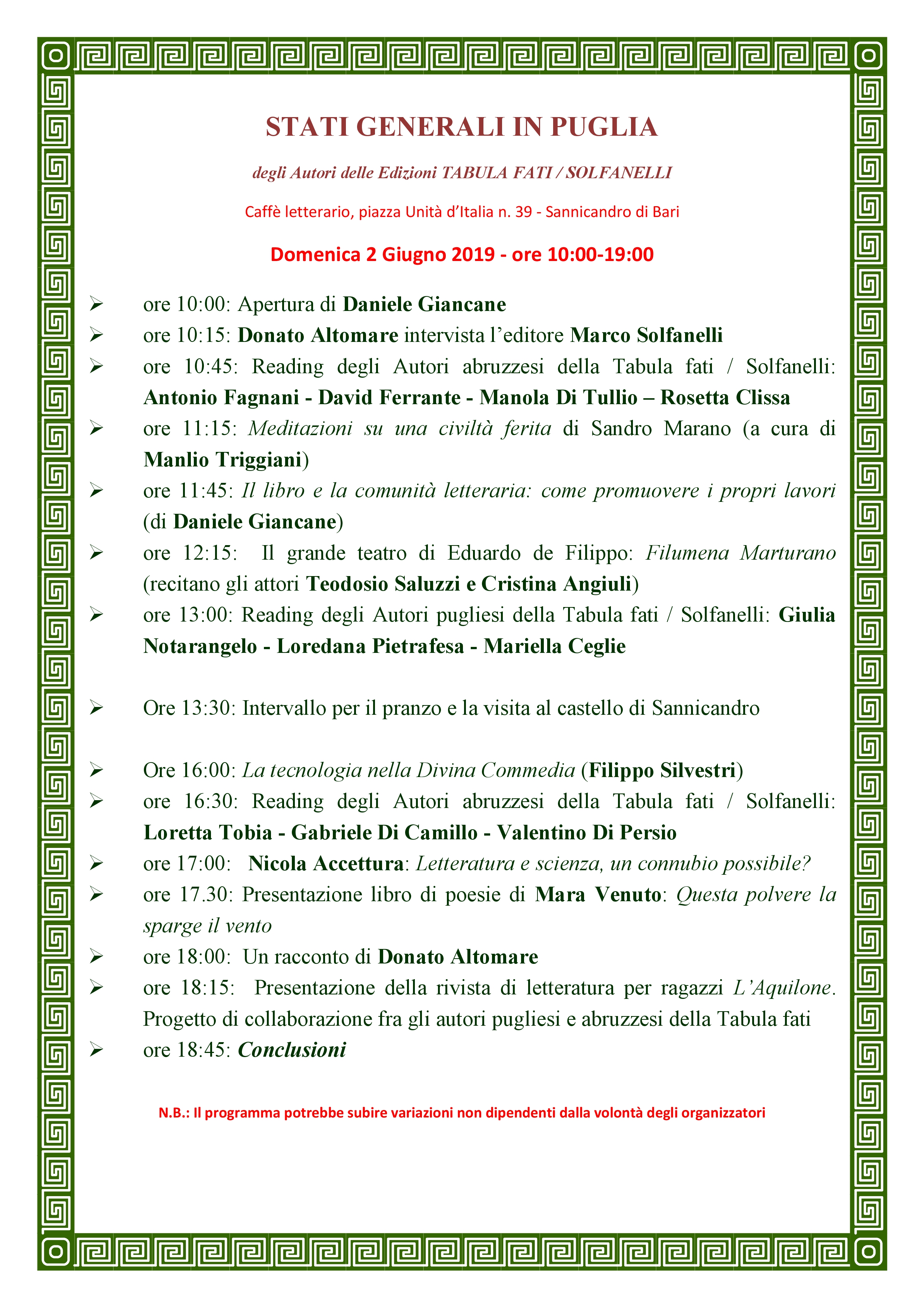 Stati generali di Tabula Fati/Solfanelli in terra di bari Domenica 2 Giugno 2019, dalle ore 10,00 alle ore 19,00 nella sala conferenze del Kief Book Café Piazza Unità d’Italia 38-39-40 in Sannicandro di Bari (BA), un “Caffè Letterario” per eventi musicali, teatrali e recital, sito in un palazzo d’epoca, si terranno gli Stati Generali degli autori delle Edizioni Tabula Fati/Solfanelli organizzati dal prof. Daniele Giancane.