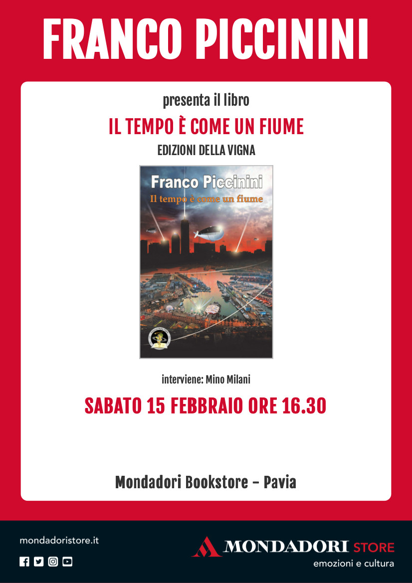 Presentazione di “Il tempo è come un fiume“ Sabato 15 febbraio 2020, dalle ore 16:30 alle 19:30, presso la libreria “Mondadori Bookstore“, Piazza della Vittoria, 8 a Pavia, lo scrittore Franco Piccinini, socio world presenterà il suo ultimo libro “Il tempo è come un fiume“ (Edizioni Della Vigna), da pochi mesi sul mercato dell’editoria. Parteciperà alla conferenza lo scrittore Mino Milani (recente vincitore di un premio Vegetti). All’incontro saranno probabilmente presenti alcuni soci della World e di Urania Mania, tra cui Adalberto Cersosimo che ne ha scritto la prefazione.