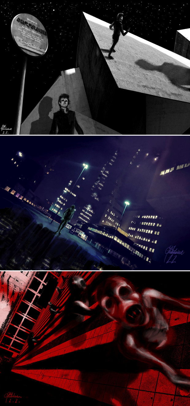 Sono visioni surreali ottenute rielaborando foto di prospettive urbane scattate da Mario, le vedete montate alla fine del servizio quando si parla delle strade delle nostre metropoli attuali: si tratta dell’avanguardia del nuovo progetto narrativo dei due “natural born killers” del fantastico italiano, sempre in ebollizione verso nuove frontiere, ora che il loro primo parto (Situation Tragedy) è in via di pubblicazione (e QUI vedete un breve book trailer montato da Daniele Filippone per il progetto Condivisioni Urbane di Animanera). Non si sa ancora nulla della trama, se non che il titolo di lavorazione (Palindrome) rimanda agli sfasamenti temporali di Tenet e gli autori lasciano trapelare qualche fallout degli pseudobiblia della follia, come Il Re in Giallo.